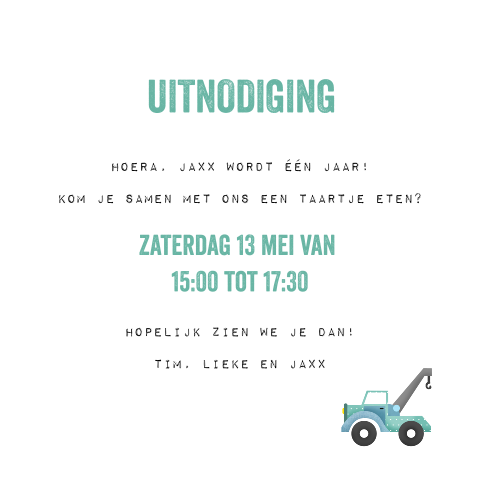 Dan nodig je daar natuurlijk ook kinderen voor uit. Een leuke manier om de uitnodiging te maken is een tekst erop zetten zodat het lijkt alsof het kind de gasten zelf uitnodigt! De tekst van de uitnodigingen kun je eenvoudig zelf aanpassen in onze online ontwerptool. Je zoon of dochter viert een kinderfeestje.